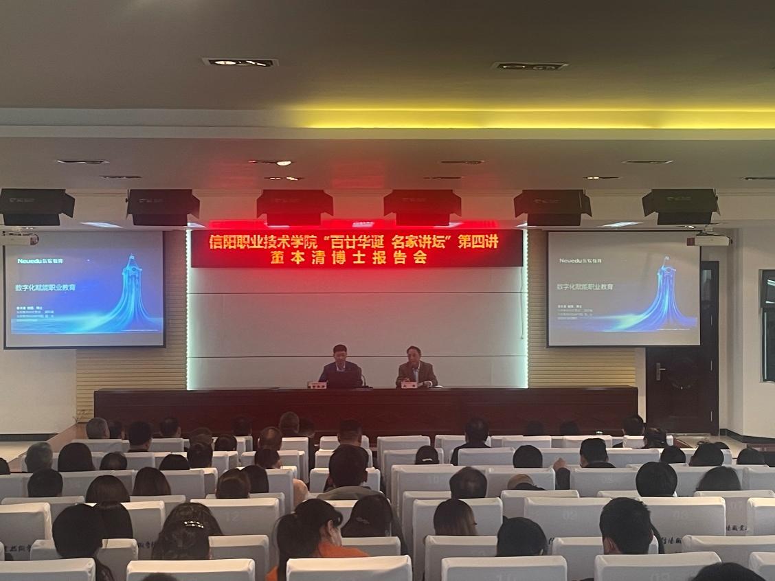 3月28日下午,东软教育科技集团副总裁、东软教育科技研究院经理董本清博士应邀到公司作了题为《数字化赋能职业教育》的报告会。公司党委书记郑洪涛,副董事长王豪、郑延芳、李新毓、教务处处长余磊、党办主任张国锋、best365官网院长黄德成、党总支书记严正香等全校副科级以上干部及各教公司部基层教学组织负责人参加了报告会,会议由王豪副董事长主持。