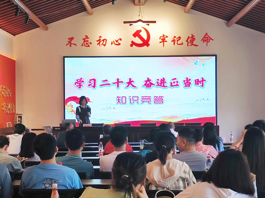 六月的南雷村,草木葱茏,生机盎然。党员同志们首先聆听了党的二十大代表、南雷村村支部书记张庭莲的《牢记领袖嘱托,坚守初心使命,奋力谱写“两个更好”美好篇章》主题党课。南雷村以前是大别山革命老区的典型贫困村,从深圳返乡过年的张庭莲看到村里的落后面貌,萌发了回乡创业带领乡亲脱贫致富的想法。2016年,张庭莲创办了利用废弃秸秆制作工艺品的公司——信阳农林谷生态农业有限公司,几年下来,不仅解决了南雷村燃烧秸秆污染环境的问题,还实现了农旅融合发展,产品通过线上线下销售到全国各地,年利润达到400余万元,吸纳了100余名农民就业,助力94户191名贫困群众脱贫摘帽,先后带动南雷村发展起了生态牛养殖、红薯深加工、豆腐加工、草莓采摘等特色产业,帮助群众走上致富快车道。近几年,南雷村新修了6公里道路,安装上了100多盏太阳能灯,新建了2座旅游公厕,家家户户用上了自来水和卫生厕所,以实际行动践行了习近平总书记对大别山革命老区“两个更好”的殷殷嘱托。张庭莲的党课生动朴实,催人奋进,南雷村五年的翻天覆地变化更是引发了老师们的一片赞叹,大家纷纷报以热烈掌声。党课结束后,老师们现场开展了党的二十大知识竞答活动,现场气氛热烈,同志们踊跃抢答,展示了较好的政治理论素养,一度把主题党日活动推向了高潮。